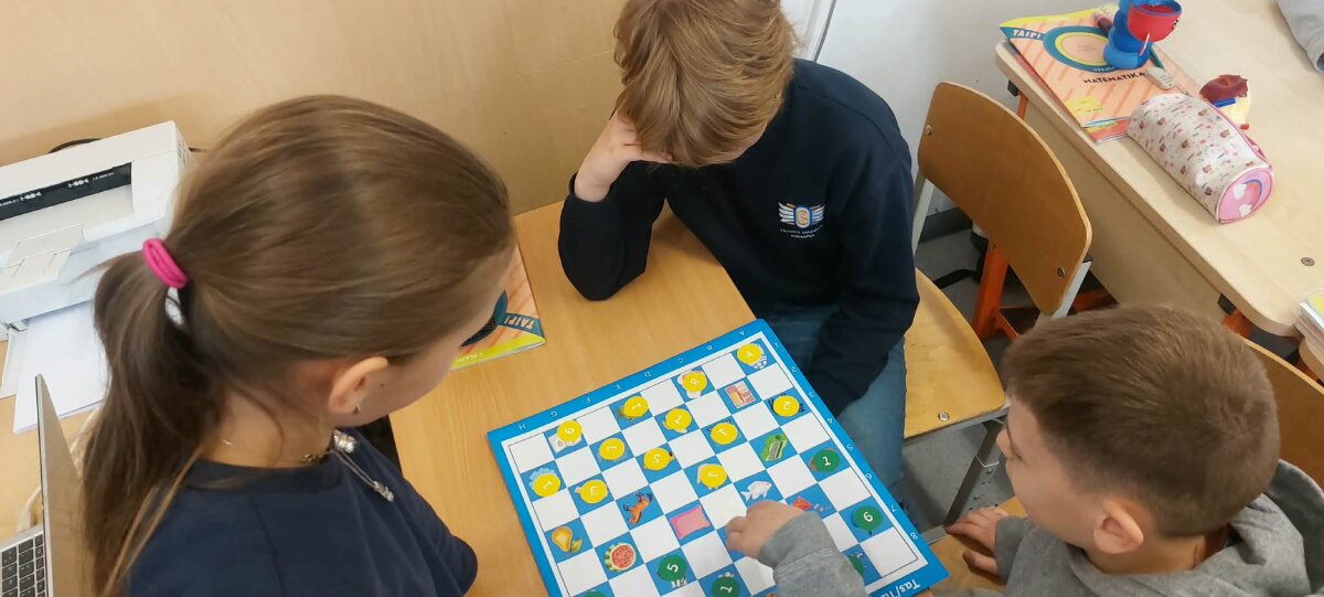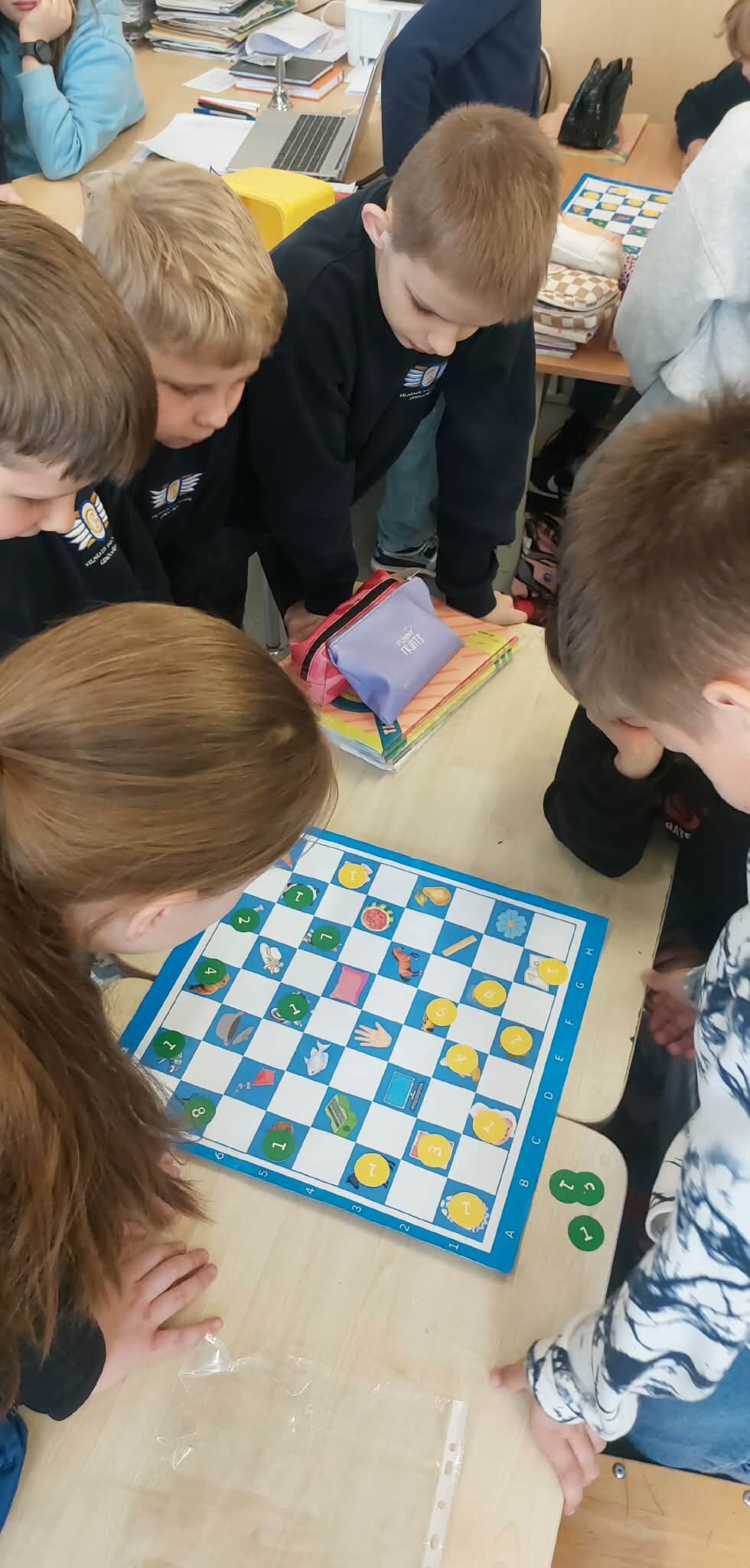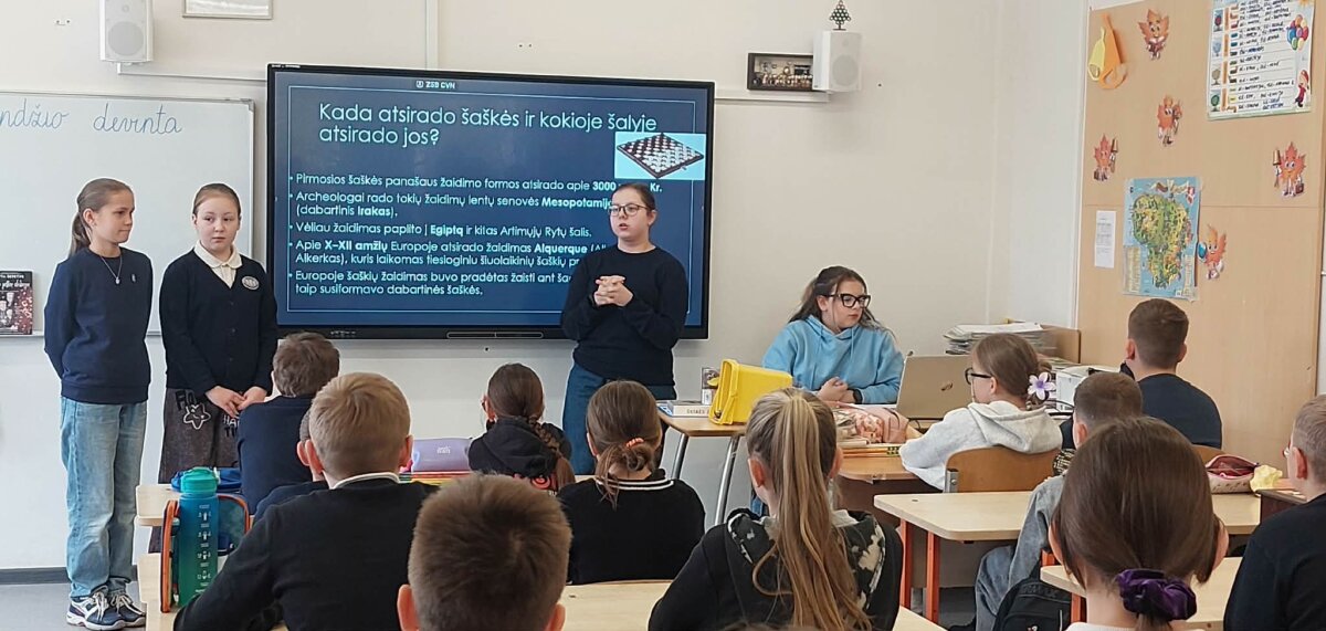 2026 m. balandžio 9 d. 5 A klasės mokiniai kartu su matematikos mokytoja M. Narkevičiene ir bibliotekininke L. Ostrovska aplankė 4 A ir 4 B klasių mokinius bei jų mokytoją D. Dubasienę. Penktokai ketvirtokams papasakojo apie šaškių žaidimo atsiradimą, istoriją, taisykles ir žymiausius čempionus.