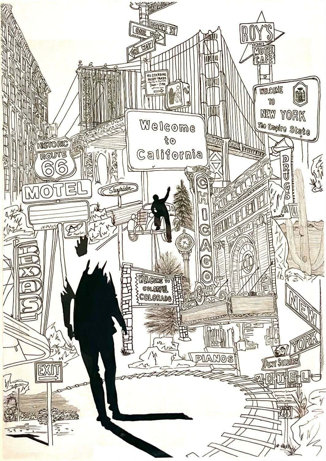 - J. Keruakas „Kelyje“ – piešinyje perteikiamas nuolatinis judėjimas, laisvės troškimas ir vidinis nerimas. Kelias vaizduojamas kaip būsena, o ne konkretus maršrutas.