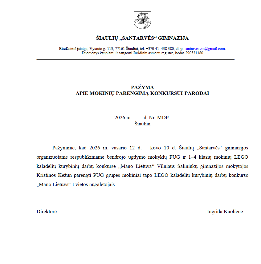 Priešmokyklinio ugdymo B (PUG B) grupės vaikai dalyvavo 2026 m. vasario 12 d. – kovo 10 d. vykusiame Šiaulių „Santarvės“ gimnazijos organizuotame respublikiniame bendrojo ugdymo mokyklų PUG ir 1–4 klasių mokinių LEGO kaladėlių kūrybinių darbų konkurse „Mano Lietuva“.