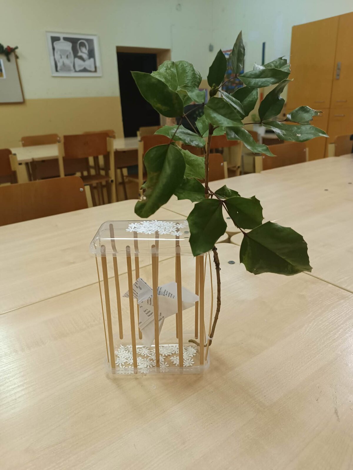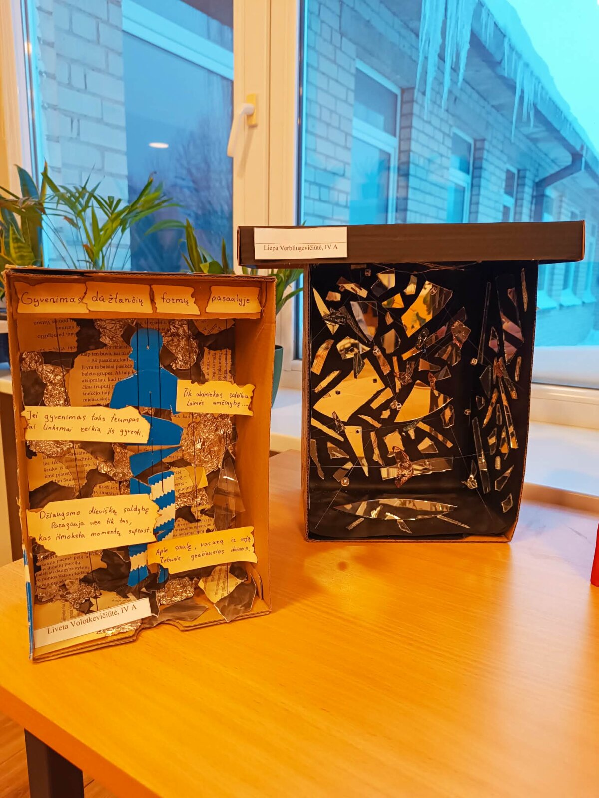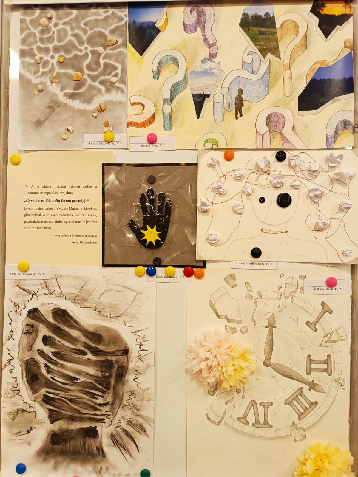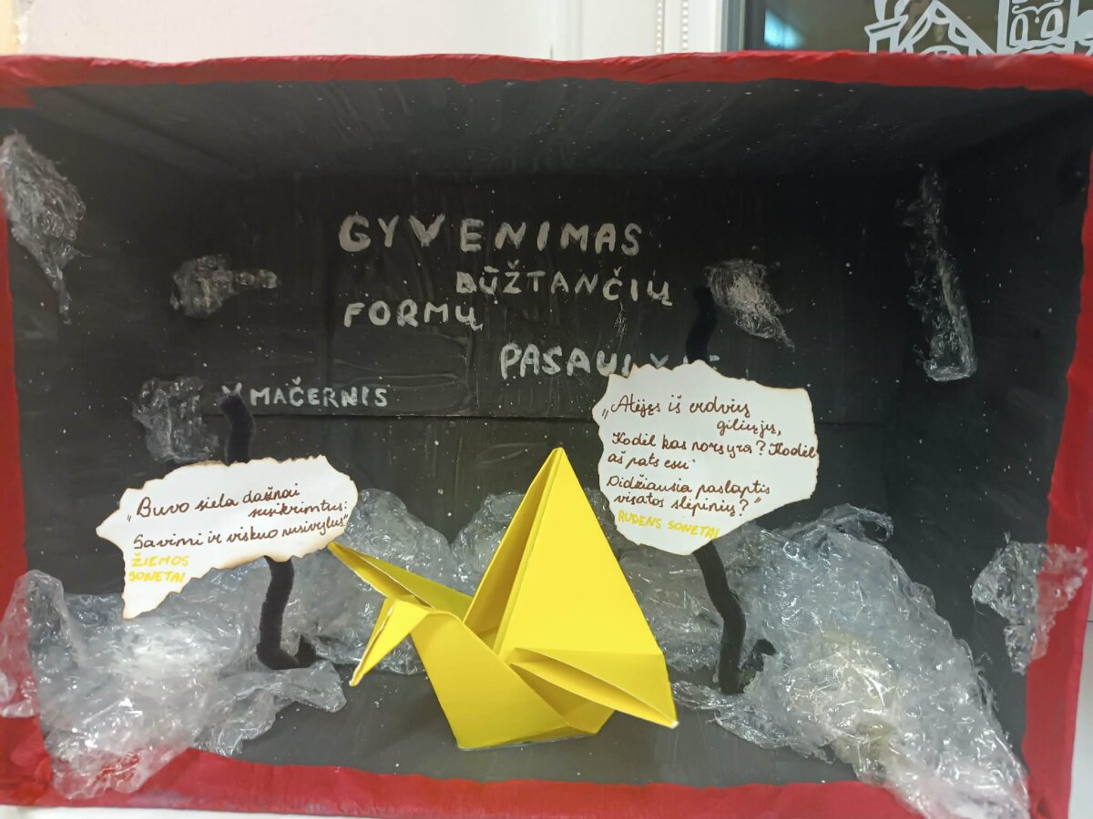 Prieš Kalėdų atostogas IV A ir IV B gimnazijos klasių mokiniai per lietuvių kalbos ir literatūros pamokas įgyvendino trumpalaikį kūrybinį projektą „Gyvenimas dūžtančių formų pasaulyje“. Projekto metu gimnazistai, įkvėpti lietuvių poeto Vytauto Mačernio kūrybos ir egzistencializmo idėjų, ieškojo savitų būdų atskleisti žmogaus būties trapumą, laiko tėkmę, vidinius išgyvenimus bei egzistencinius klausimus.