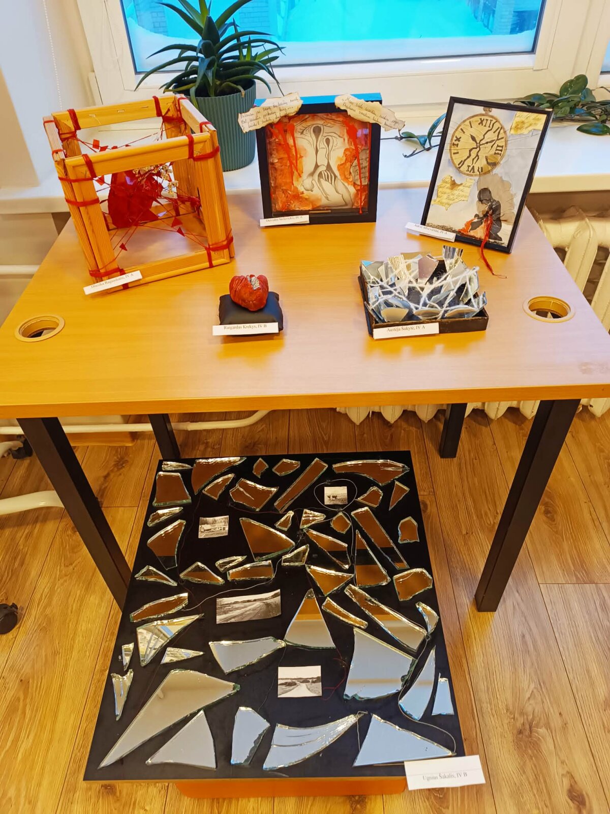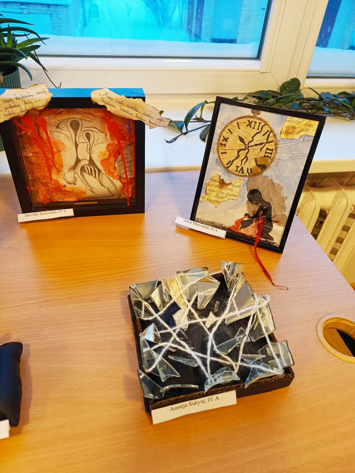 Mokiniai savo kūrybinius darbus atliko pasitelkdami netradicines raiškos priemones ir įvairias technikas: asambliažą, koliažą, lankstymą, erdvines instaliacijas, mišrias technikas. Darbuose derinami skirtingi paviršiai, formos, tekstūros, simboliai – nuo dūžtančio veidrodžio šukių, siūlų, laikrodžio detalių iki popieriaus fragmentų, tekstinių citatų ir piešinių. Tokia raiška leido mokiniams ne tik vizualiai perteikti idėją, bet ir ją apmąstyti bei interpretuoti.
